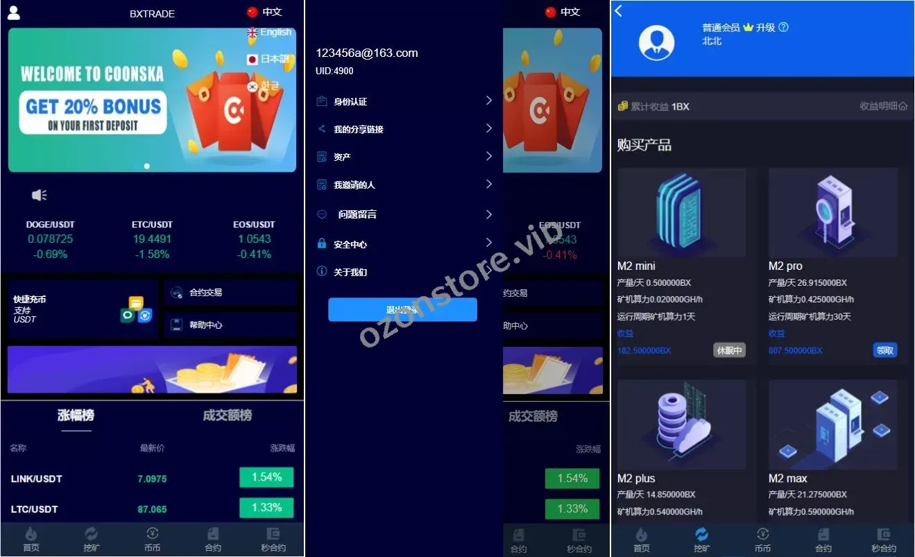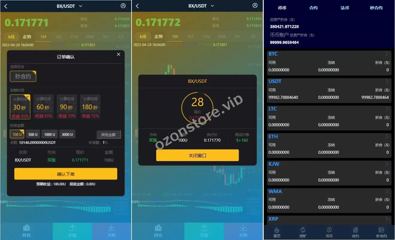 - 全面功能:支持币币交易、合约交易、秒合约、质押挖矿、实名认证、邀请推广等功能。