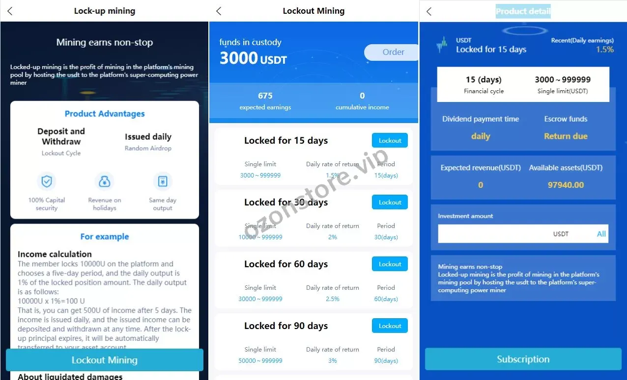 🔹 锁仓挖矿:引入了 锁仓挖矿 功能,用户通过锁仓虚拟币进行挖矿,享受长期稳定收益,增加平台的投资吸引力。