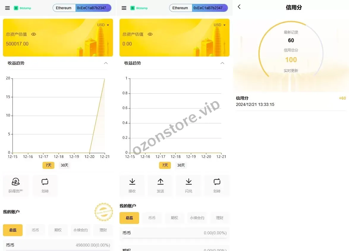 - 前端账户支持 真实账户 和 模拟账户,模拟账户每月可领取虚拟资产,方便用户体验平台功能。